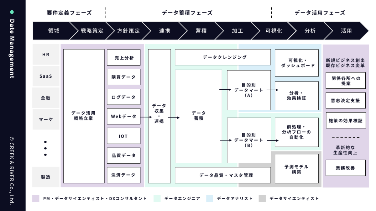 その場合は、データ活用の全体フローを整理し、自社の課題を当てはめたうえで、今どの工程に人材が必要なのかを見極めることが有効です。