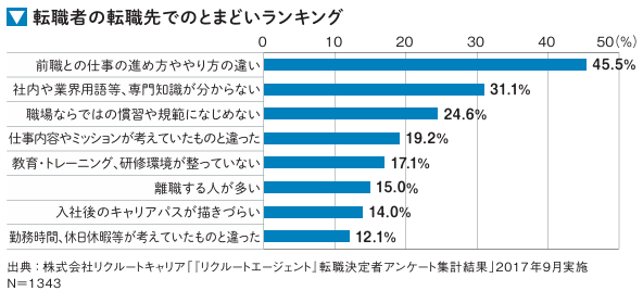 また、『リクルートエージェント』転職決定者アンケート集計結果(※3)によれば、転職者の転職先での戸惑いランキングとして以下のようなものがあります。