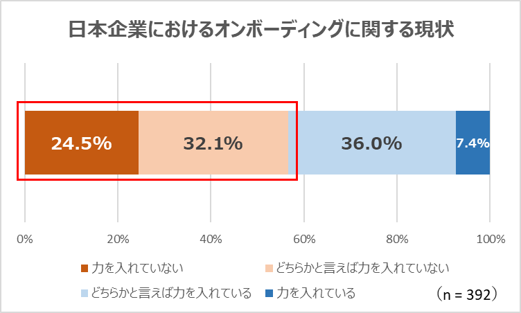 しかしながら、尾形(2021)「中途採用人材を活かすマネジメント ー転職者の組織再適応を促進するために」(※4)によると、企業における現状は、オンボーディングに「力を入れていない」、「どちらかと言えば力を入れていない」と回答した企業の割合は合計56.6%と過半数を超えており、多くの企業でキャリア入社者への体系的な支援が不足していることが明らかになっています。