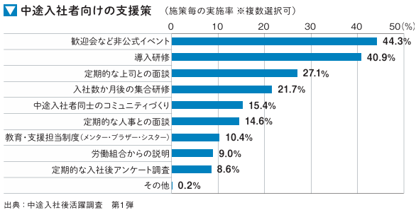 また、リクルートキャリア「中途入社後活躍調査 第1弾」2018年10月(※5)を見ても、キャリア入社者向けの各支援策が取られている会社の割合はあまり多くはなく、実施率が44.3%と最も高い「歓迎会など非公式イベント」でも、全体の過半数を下回ることが分かります。