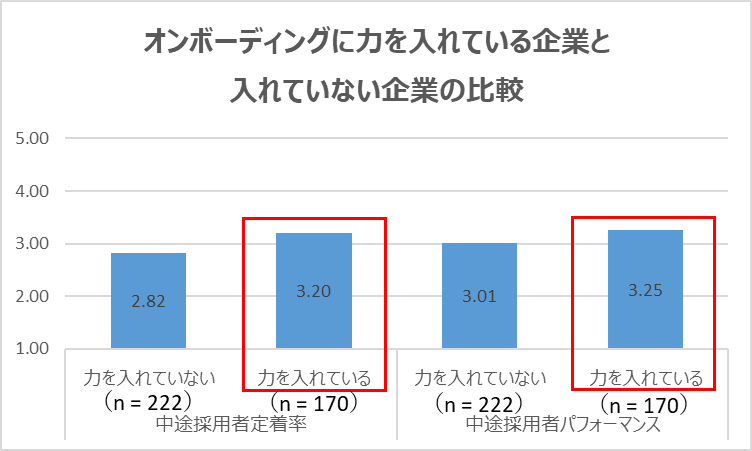 一方で、尾形(2021)「中途採用人材を活かすマネジメント ー転職者の組織再適応を促進するために」(※4)によれば、オンボーディングに力を入れている企業では、力を入れていない企業と比べてキャリア入社者の定着やパフォーマンスの水準がより高いスコアを示すということがわかっています。