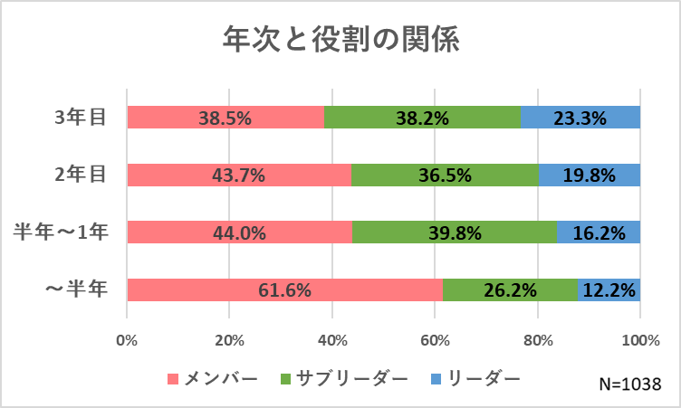 図表1より、入社半年以内ではメンバー的な役割を任されている人が61.6%と過半数を超えていますが、入社半年から2年目では、リーダー、もしくはメンバーからリーダーへ過渡期となるサブリーダー的な役割を任されている人が過半数を超え、3年目に近づくほどリーダー的な役割を任されている人の割合が増えてきます。