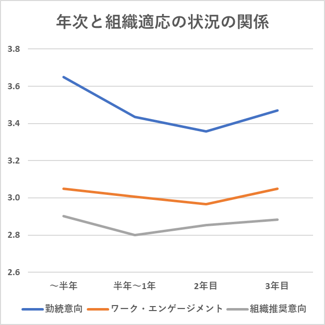 図表2は、キャリア入社者の年次別で、勤続意向、ワーク・エンゲージメント、組織推奨意向別に、組織適応の推移状況です。いずれも、半年から2年目で組織適応の状況が最も低くなっていることが分かります。これは、図表1より前述の、メンバー的な役割からリーダー的な役割へ移行していく時期に、組織適応の状況が下がりやすいことを示しています。