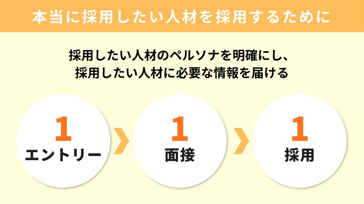 採用のゴールは「人材を採用すること」ではなく、「長期的に自社で活躍し、貢献する人材を採用すること」です。その理想形が「1エントリー・1面接・1採用」です。