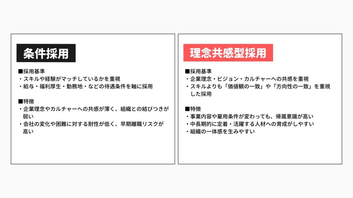 理念に共感して入社した人材は、組織文化にも自然とフィットしやすくなり、同じ価値観を共有する社員が増えることで一体感が生まれ、企業の成長にも寄与します。「理念共感」は、早期離職を防ぎ、入社後の活躍につながる人材を育てる基盤なのです。