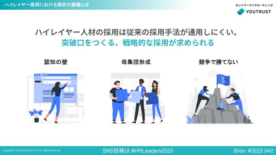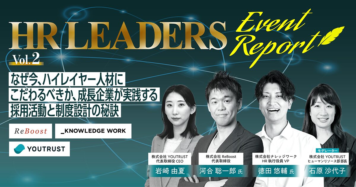 YOUTRUSTが主催するイベント『HR LEADERS』では、採用戦略の最前線を走る株式会社ReBoostの河合 聡一郎氏、株式会社ナレッジワークの徳田 悠輔氏、そして株式会社YOUTRUSTの岩崎 由夏が登壇。ハイレイヤー人材を惹きつけ、採用へと導くための具体的な戦略と実践知が語られました。