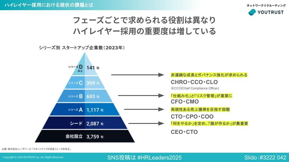 企業の成長フェーズが進むにつれ、求められる役割は変化し、ハイレイヤー採用の重要度は増していきます。特にスタートアップが非連続な成長とガバナンス強化を目指すフェーズでは、CFOやCTO、CHROといった経営幹部の獲得が事業の成否を分けると言っても過言ではありません。