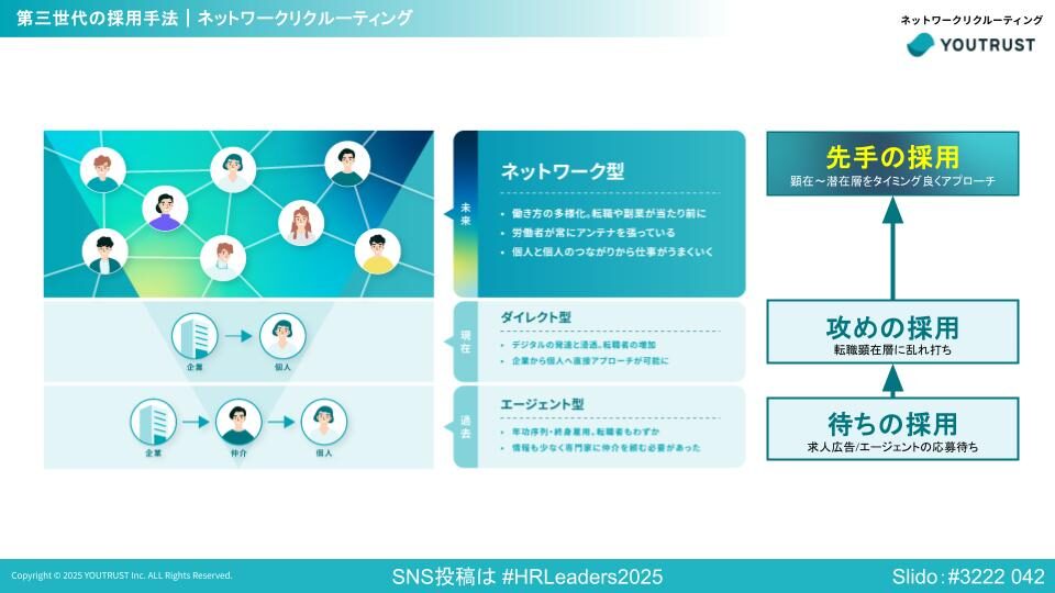 そして今、平均転職回数が3回に近づく中で、第3世代である「ネットワークリクルーティング」の時代が来ています。3回も転職を経験すると、そのネットワークは広がり、「知り合いに副業を頼まれていたら、そのまま誘われた」といったケースが当たり前になる。特にトップティアの人材は、気づくと転職している世界線にいます。いかに「つながり」のネットワークを張れているかが、採用のキーになっているんです。