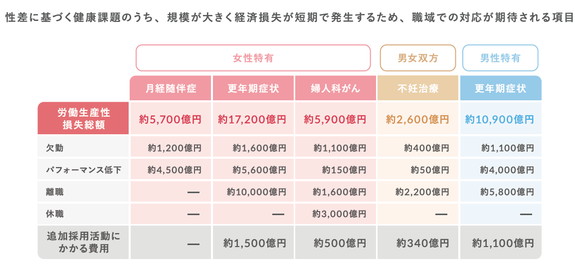 さらに更年期関連による損失は1.9兆円。女性の健康課題全体では、年間3.4兆円を超える経済損失が生じています。