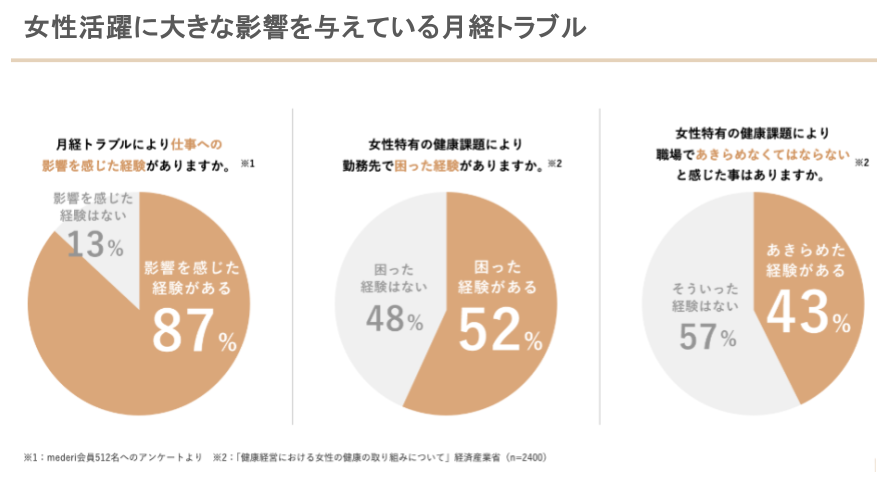 弊社の独自調査によると、働く女性の87%が「生理トラブルが仕事に影響する」と回答しています。