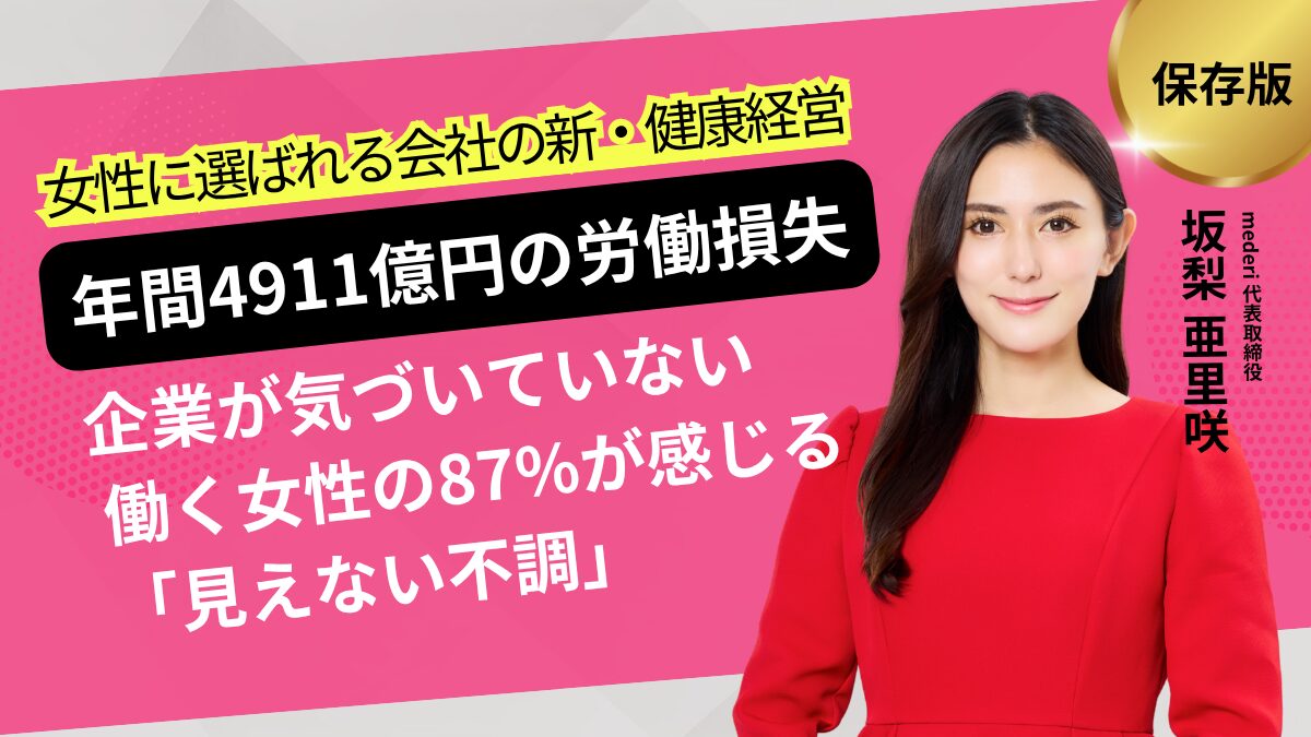 本稿では、オンラインピル診療サービスを展開するmederi 代表・坂梨亜里咲が、女性の健康課題が企業経営に及ぼす実態と、組織が向き合うべきポイントを解説します。