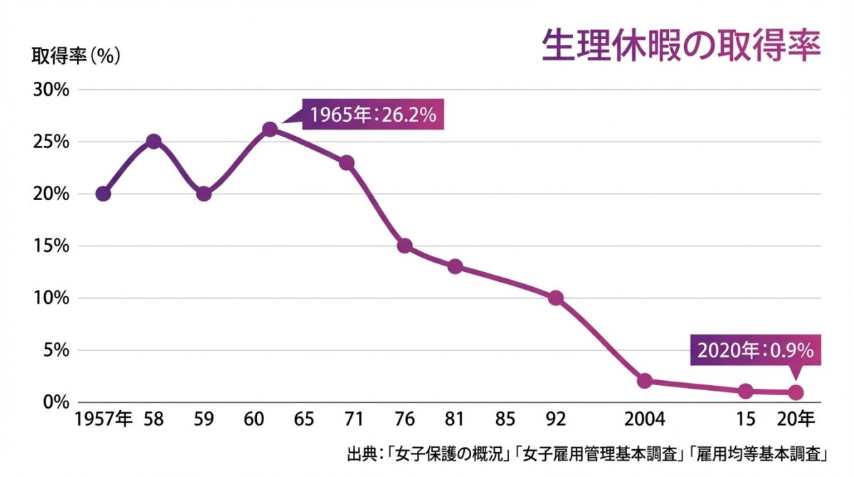 実際、日本における生理休暇の取得率は0.9%程度にとどまっているとされています。法律上認められた制度であっても、ほとんど利用されていない――この数字は、「制度があること」と「機能していること」の間に、大きな隔たりがあることを端的に示しています。