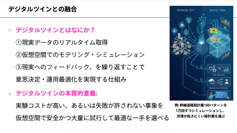そして、その仮想空間でさまざまなシミュレーションを行い、その結果をもとに「現実社会でどう動くべきか」を判断する。このプロセスをループさせることで、意思決定や運用を最適化していく仕組みのことです。