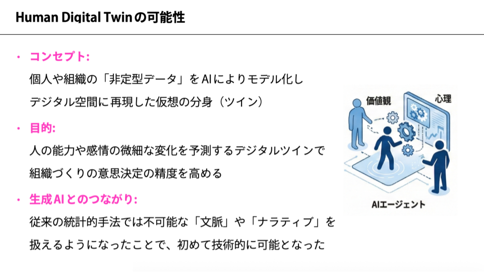 デジタルツインのアイデアに、人間や組織といった「非定型データ」を組み合わせることを、私は「ヒューマン・デジタルツイン」と呼んでいます。この仕組みの中で、人の能力や感情の微細な変化までも予測することができれば、それを踏まえた高度な組織づくりの意思決定が可能になると考えています。