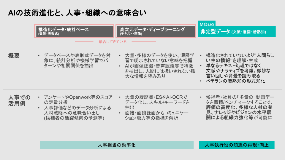 言葉の裏にある意味や文脈、さらには意図まで理解しながら、AIエージェントという形で自らデータを取りに行く。あるいは、実際に人と対話しながらデータを集めていく。そこまで可能になったことが、人事担当者の実務に影響するようになった決定的な違いだと思います。